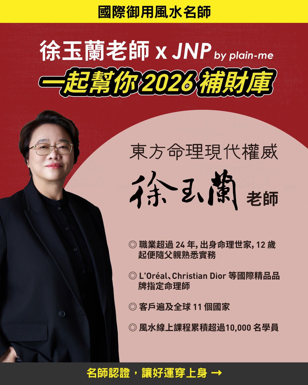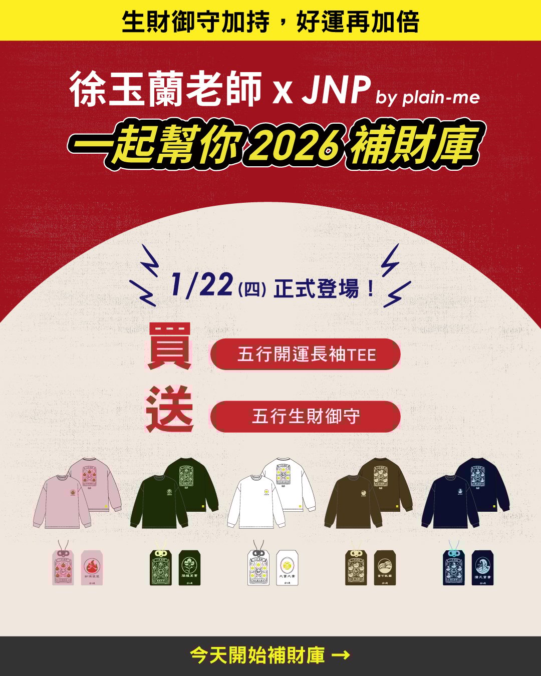 - 徐玉蘭老師 X plain-me:一起幫你 2026 補財庫:凡購買 五行開運長袖TEE 即贈送 五行生財御守 1 件。